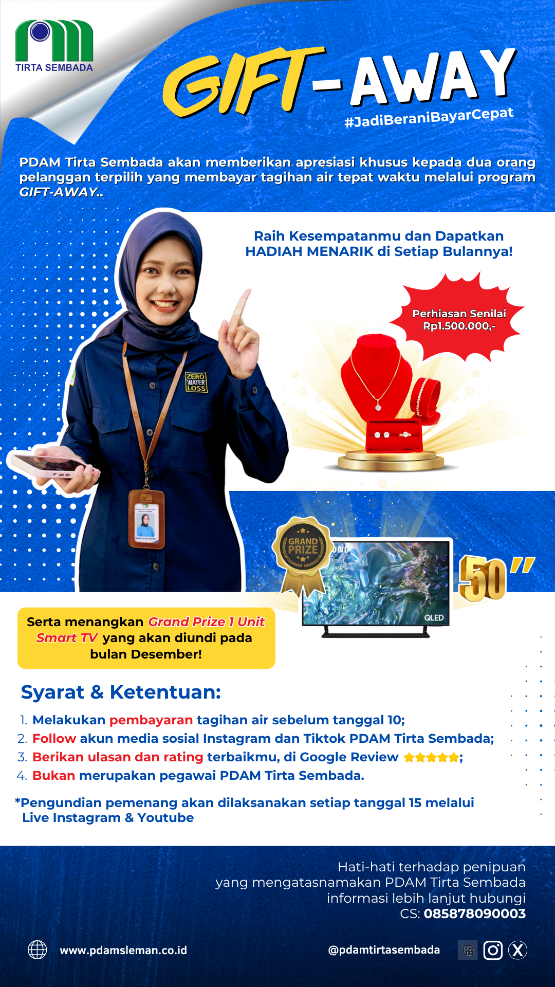 Setiap tanggal 15, PDAM Tirta Sembada akan mengundi dan memilih dua pelanggan untuk membawa pulang hadiah menarik. Adapun hadiah tersebut berupa perhiasan senilai Rp1,5 juta. Selain itu, Grand Prize 1 Unit Smart TV juga akan diundi pada Desember 2025.